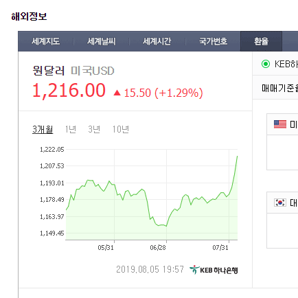 8월 5일 환율이 1216원으로 마감되었다.