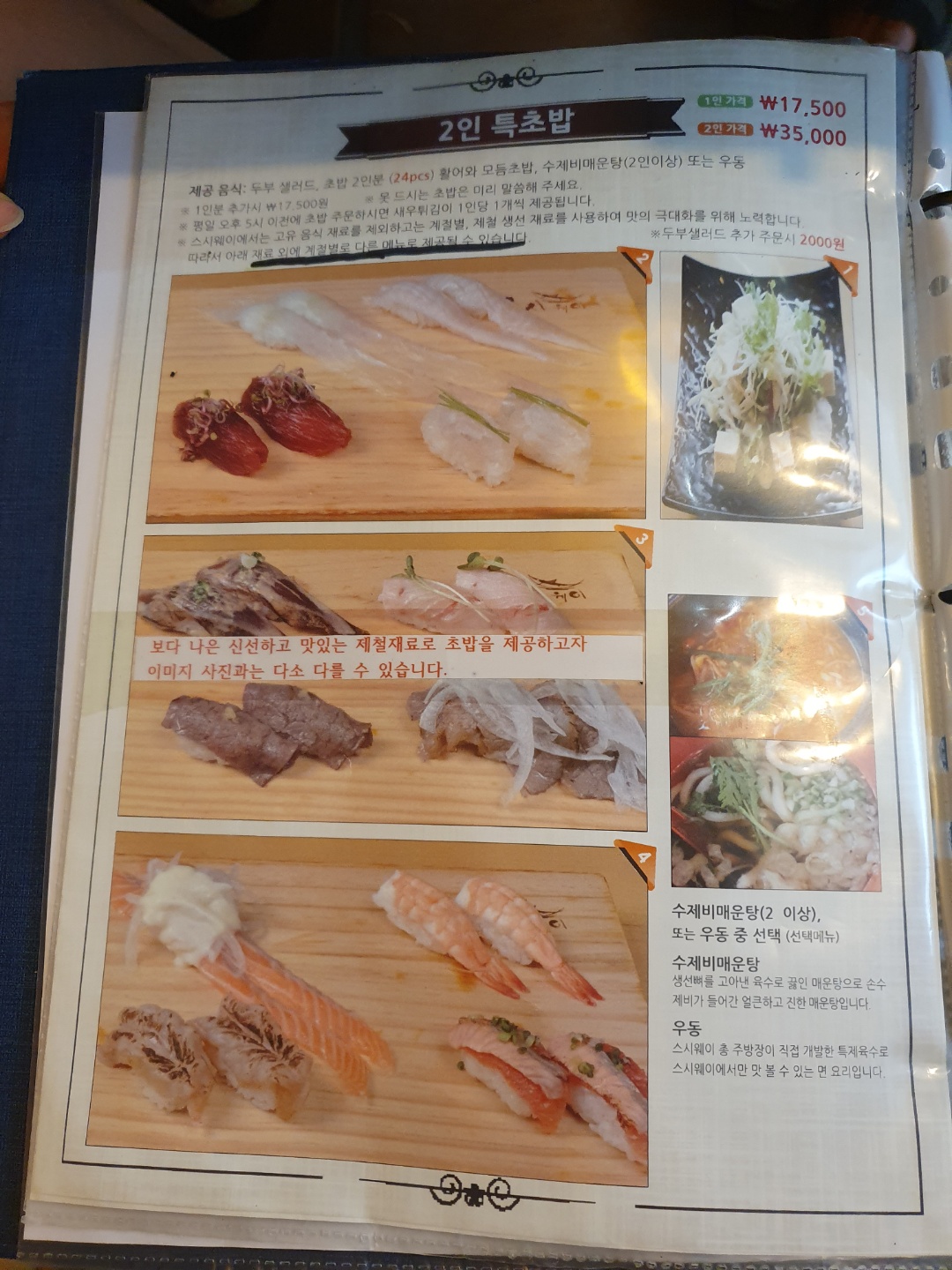특히 2인 특초밥 같은 경우, 계절별 제철 메뉴의 초밥이 종류별로 3판이 나오고, 후식으로 수제비 매운탕 또는 우동이 나오기 때문에 양껏 먹을 수 있다.