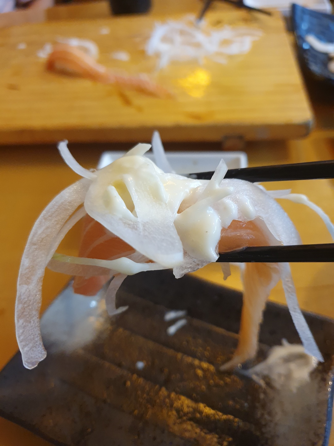 스시웨이에서 나오는 연어용 소스와 양파를 곁들여 먹으면 정말 초밥이 맛있다.