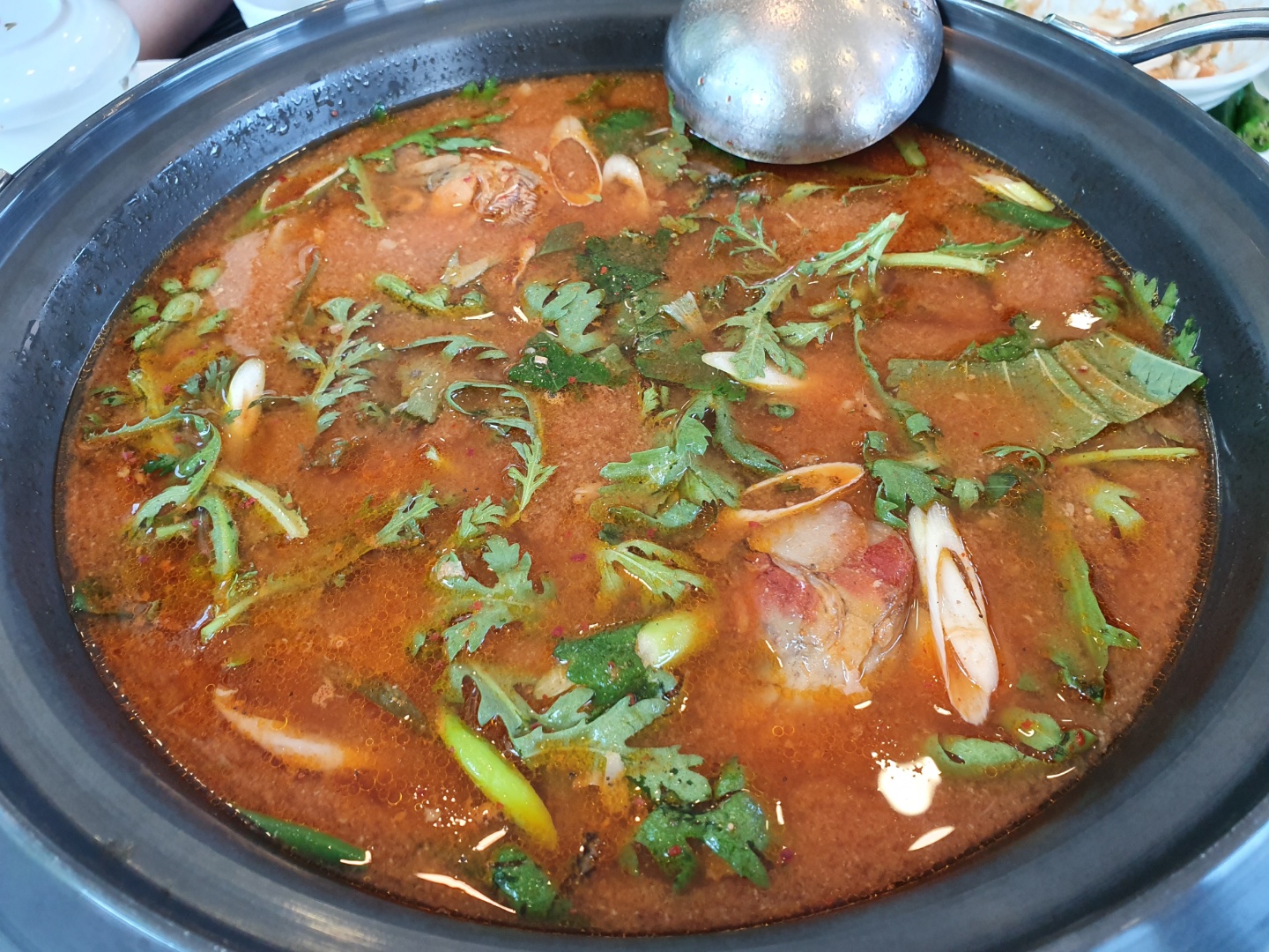 매운탕을 끓이고 보니 기름이 둥둥 떠다니는것이 보인다. 송어회가 생각보다 기름이 많은 생선인걸 매운탕을 보고 알았다.