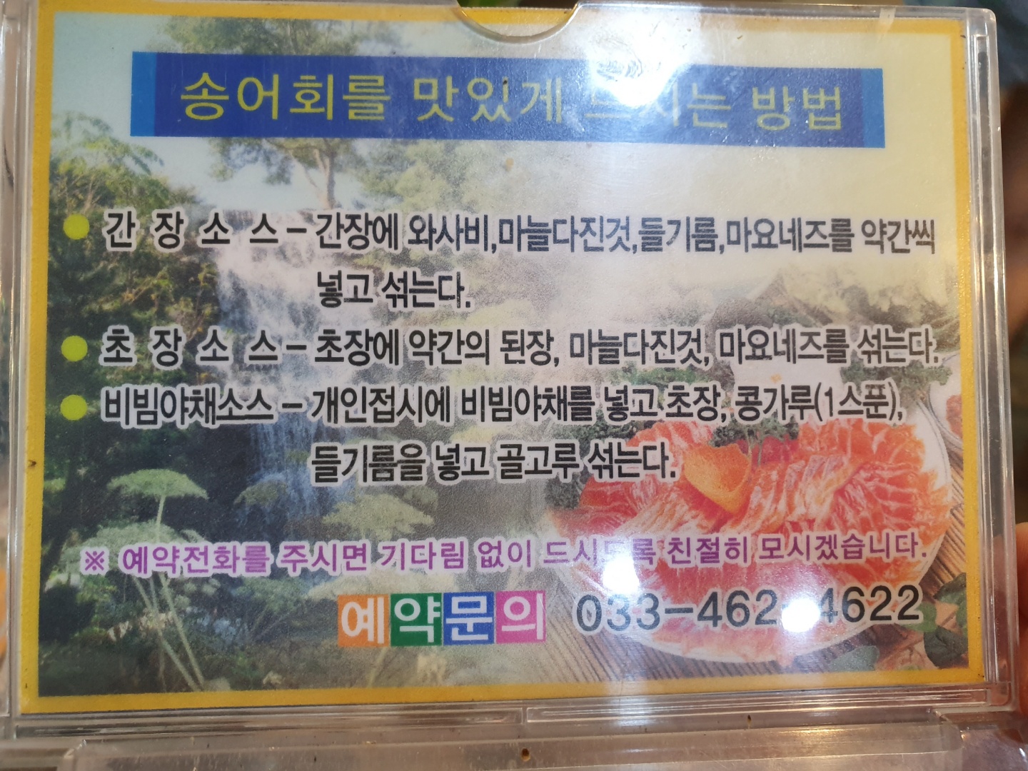 휴가 때 조금은 특별한 음식을 먹기 위해 송어횟집을 예약했다.