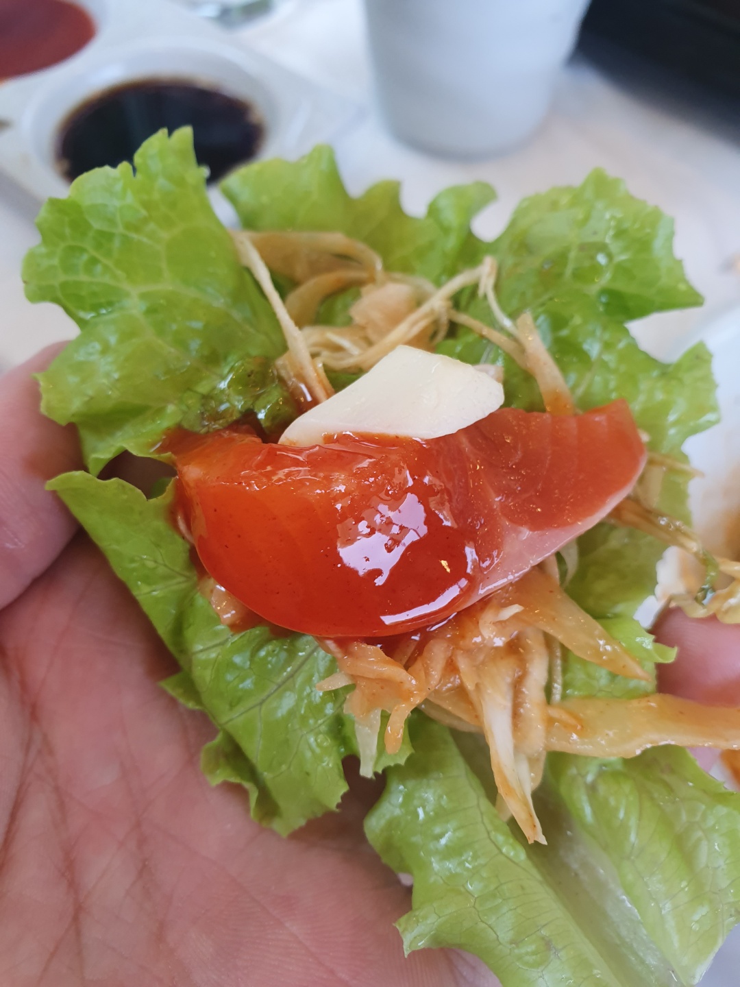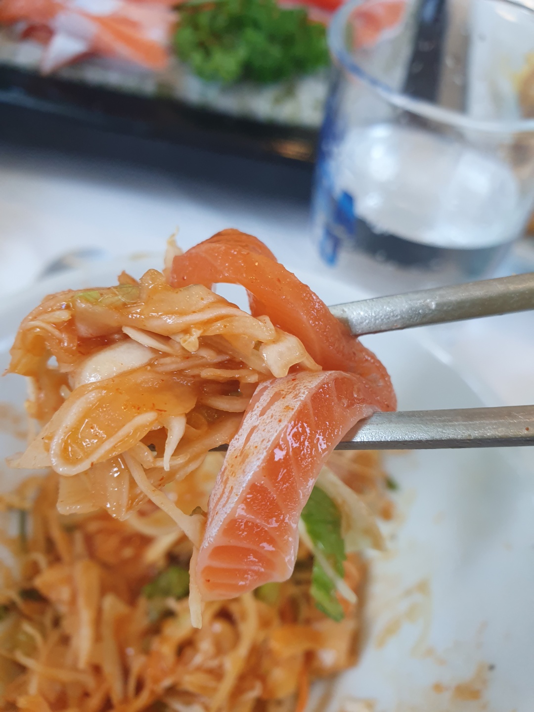 처음에는 회에 초장을 찍어서 간단히 먹었고, 다음으로는 야채와 곁들여 먹었는데 정말 조합이 좋았다.