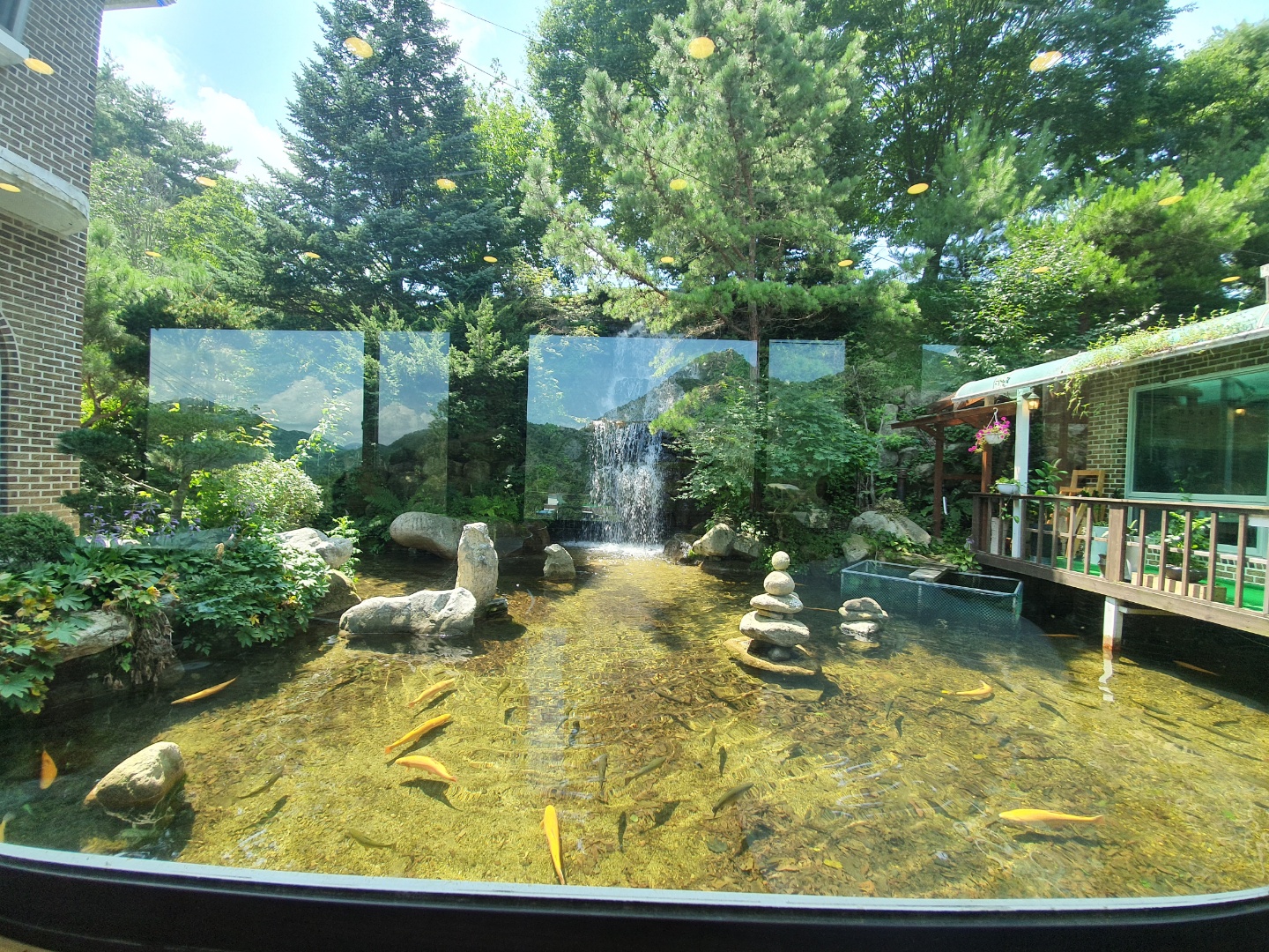 가게 내부에서 보이는 연못인데 저기 보이는 물고기들은 모두 송어라고 한다!!