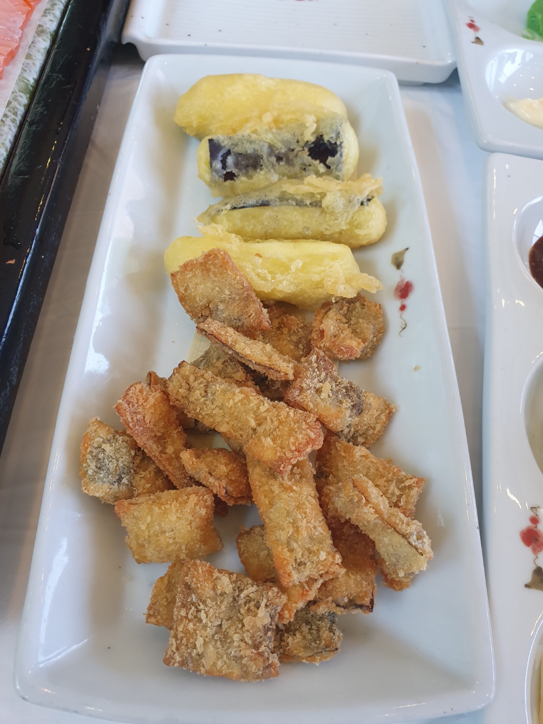 회를 조금 먹고 있는 도중 가지튀김과 송어껍질 튀김이 나왔다.
